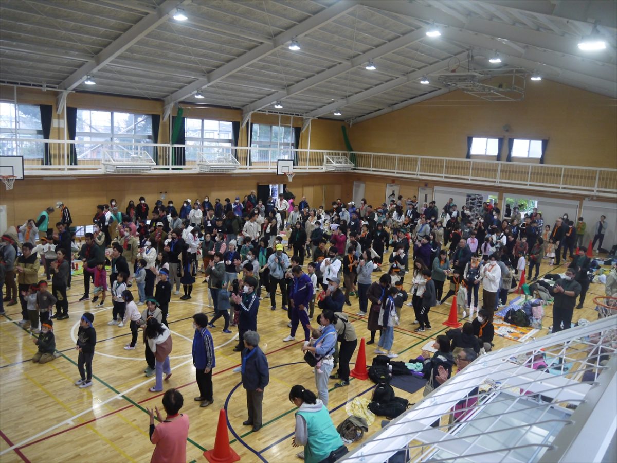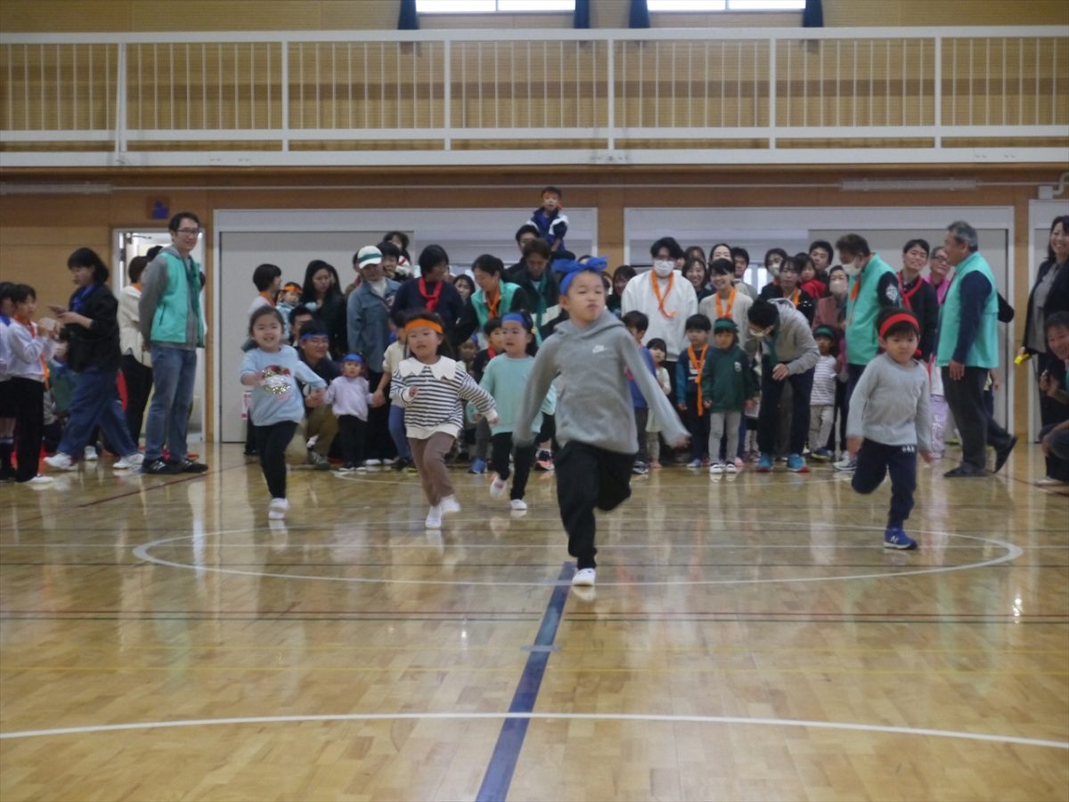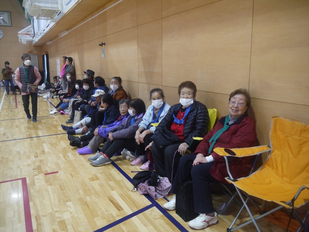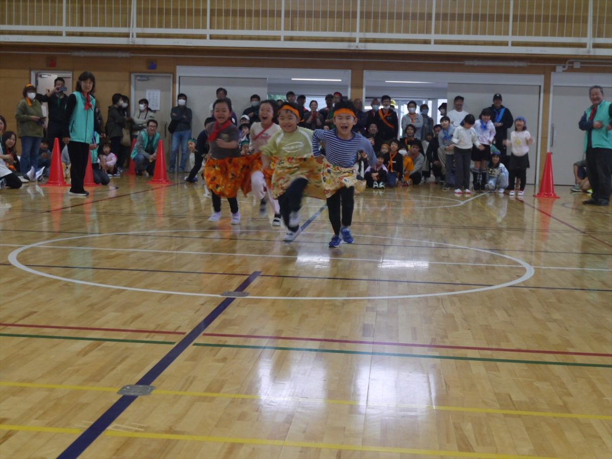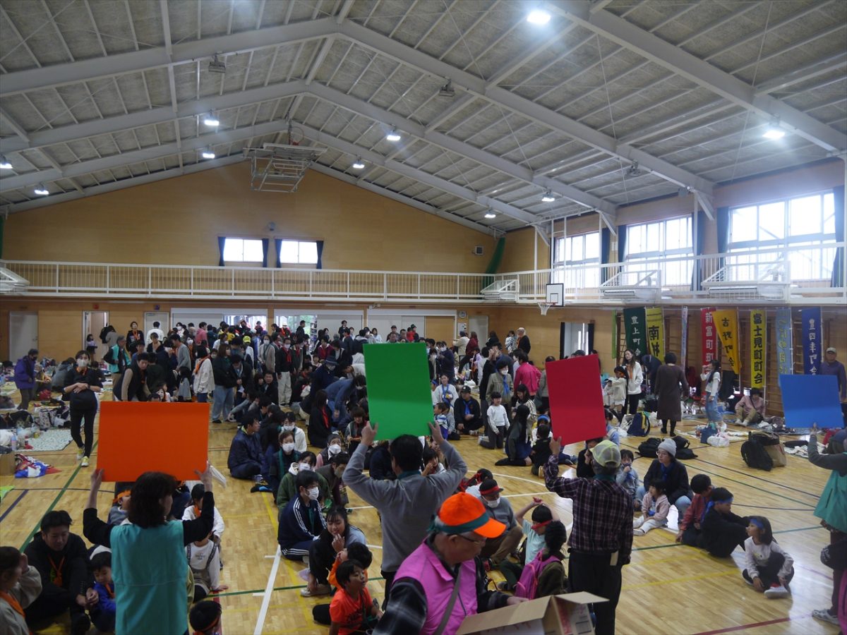 午前中は就学前児童や小学生を中心に「走るだけ」、そして全員参加の「〇×クイズ」に「デカパンリレー」、体育館に歓声が上がりました。お昼はお弁当タイムです。やはり運動会はお弁当!車座になって皆で会話も弾みました。