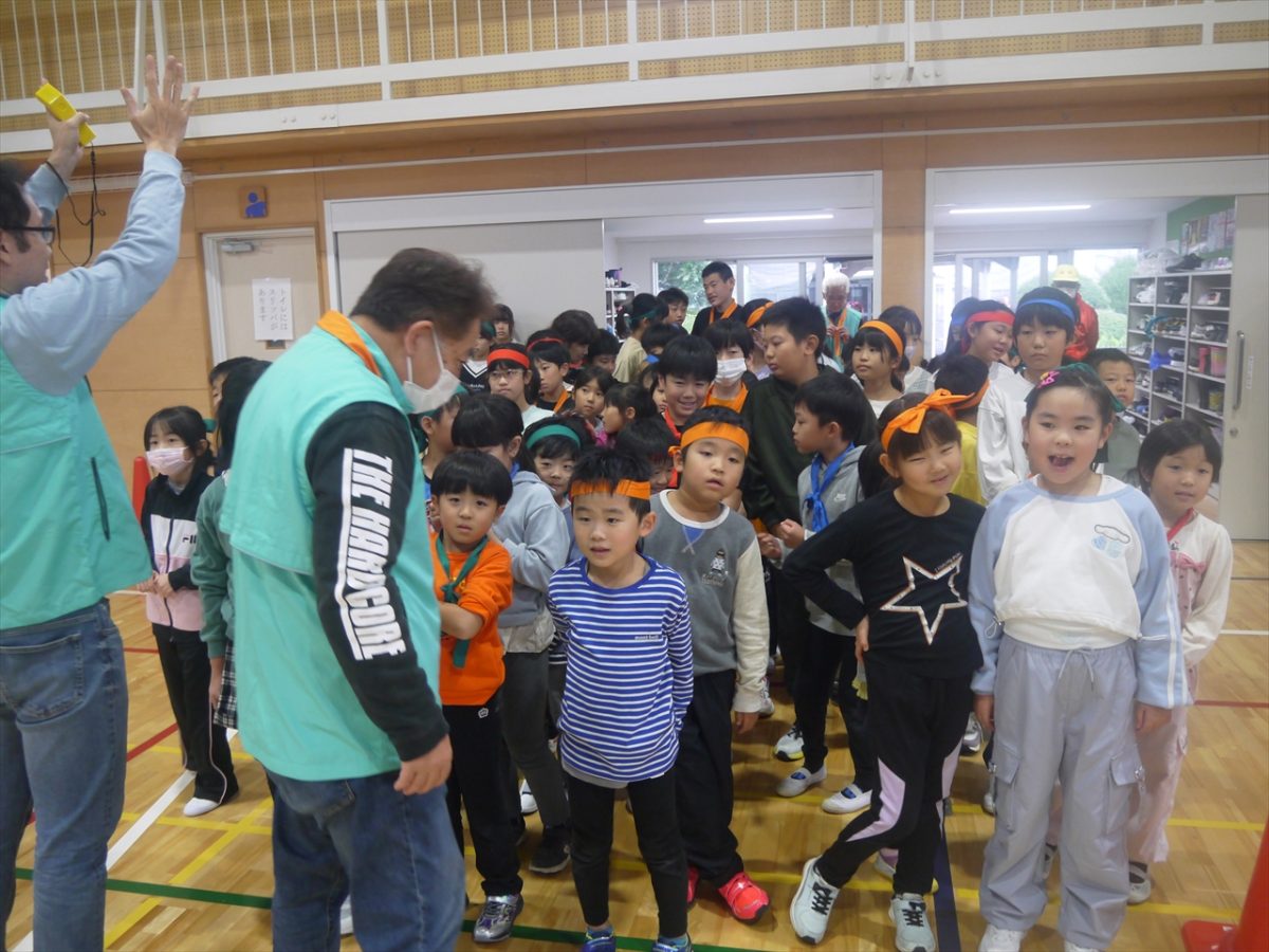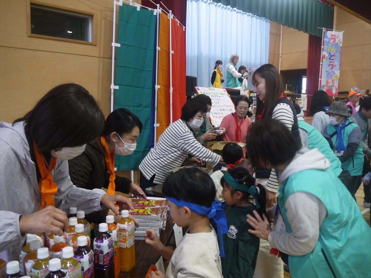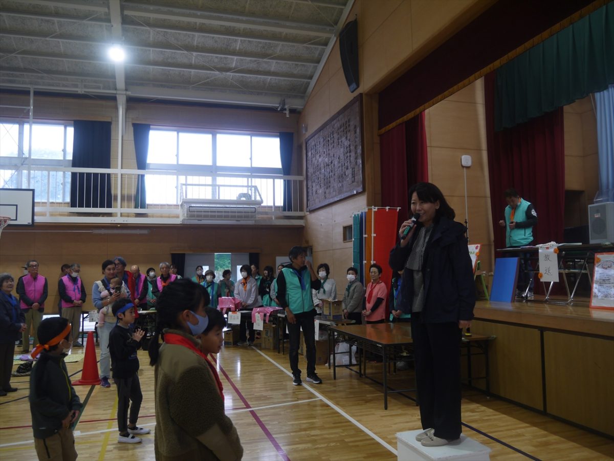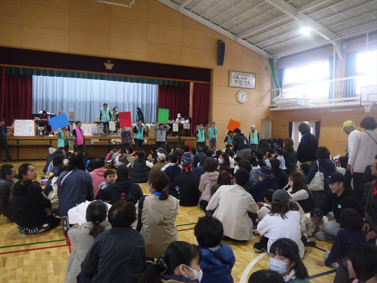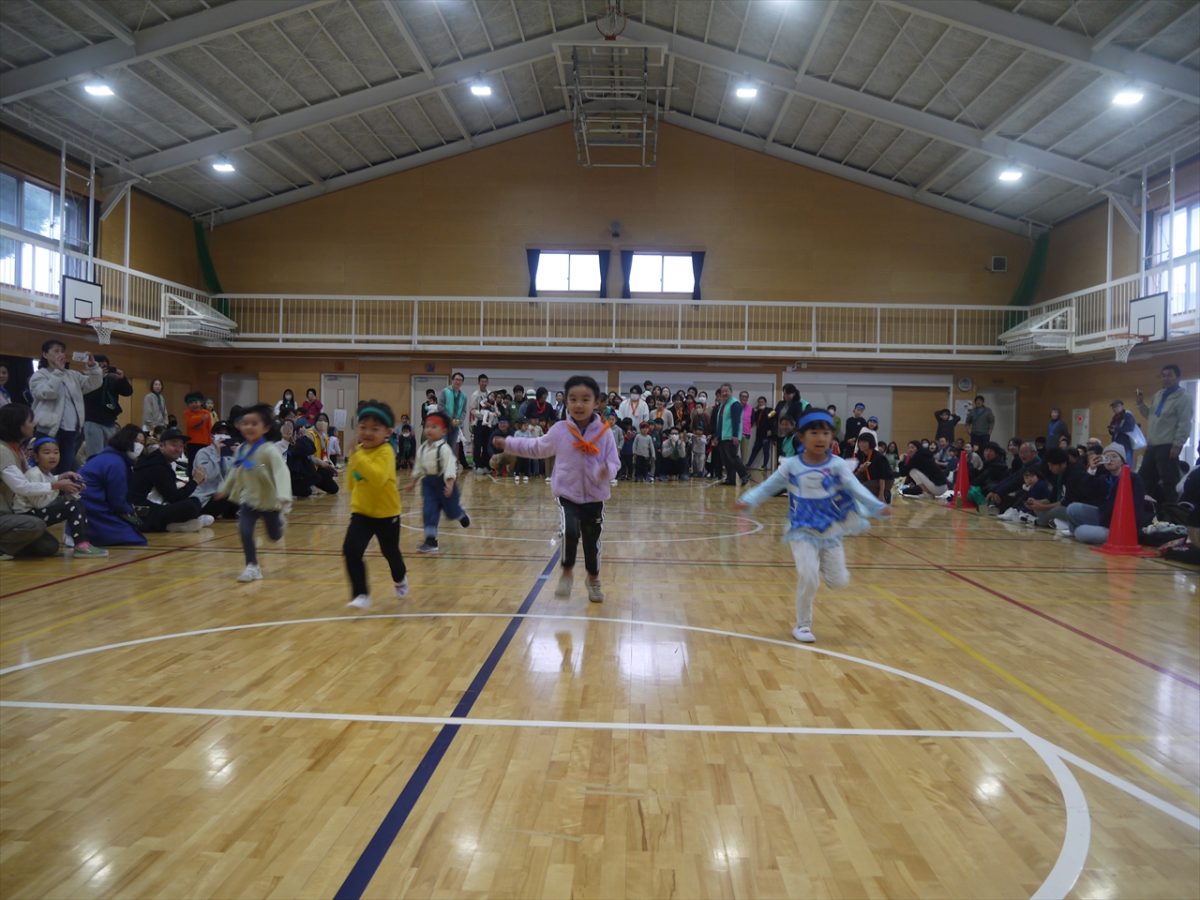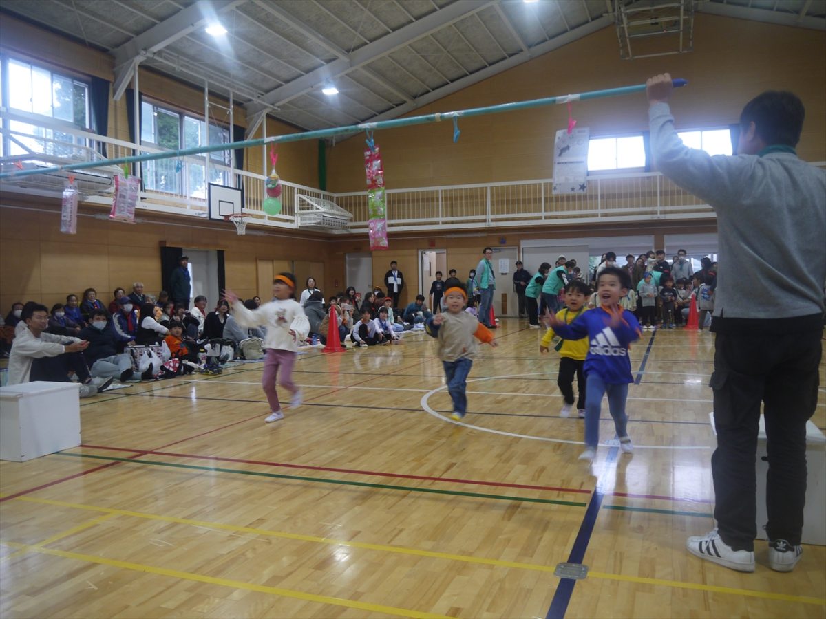 午前中は就学前児童や小学生を中心に「走るだけ」、そして全員参加の「〇×クイズ」に「デカパンリレー」、体育館に歓声が上がりました。お昼はお弁当タイムです。やはり運動会はお弁当!車座になって皆で会話も弾みました。