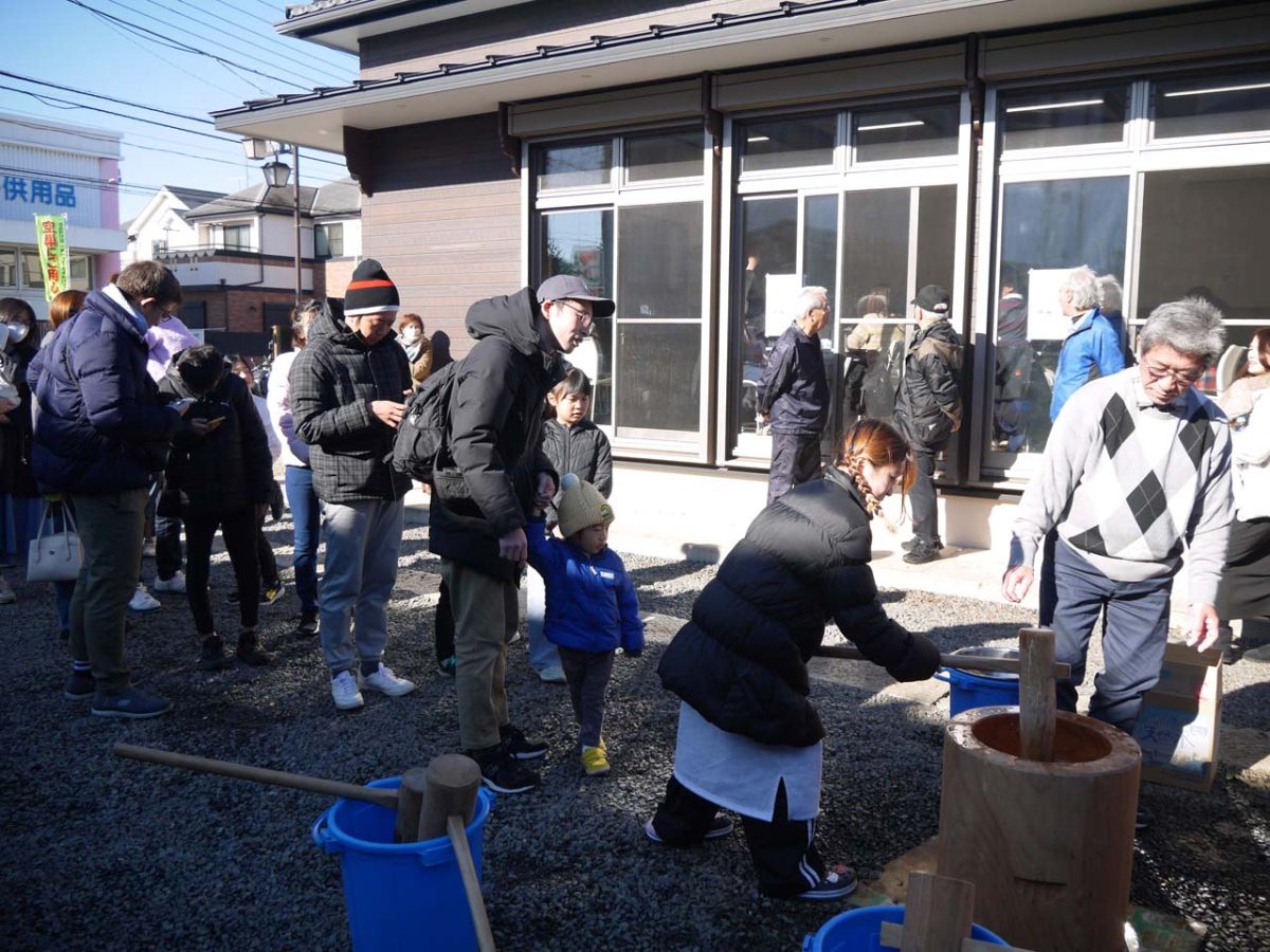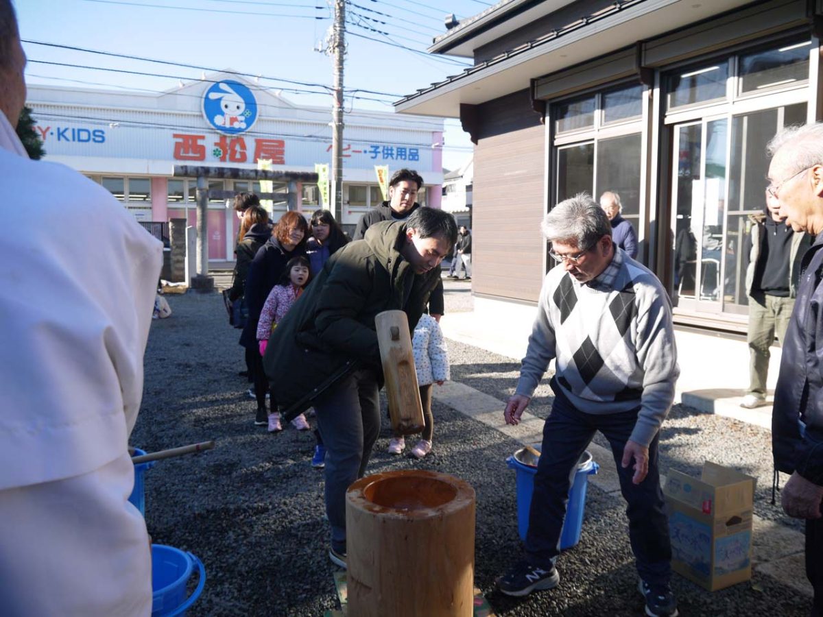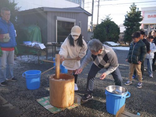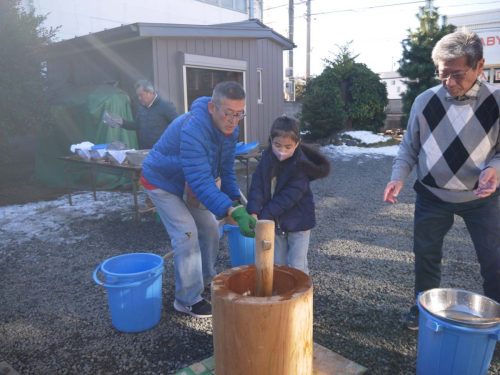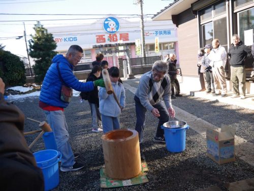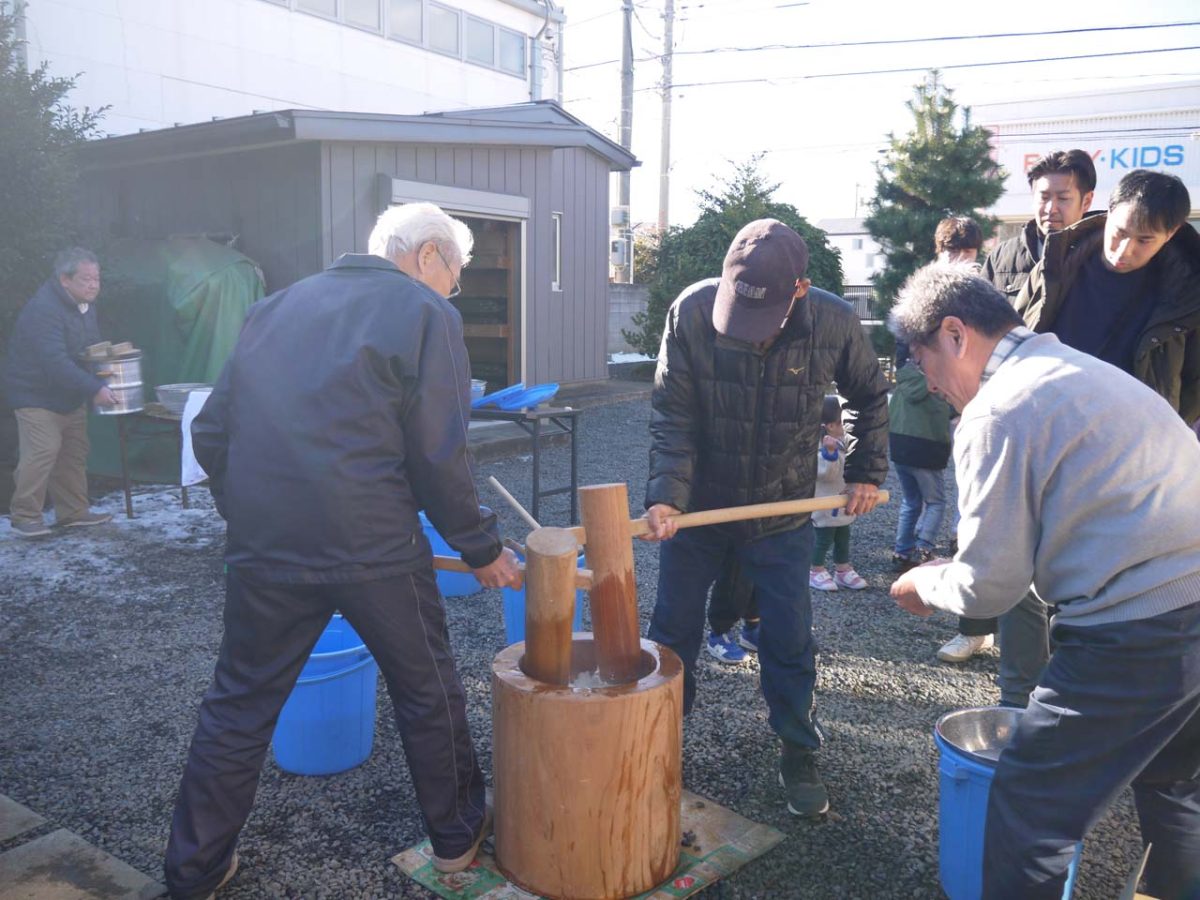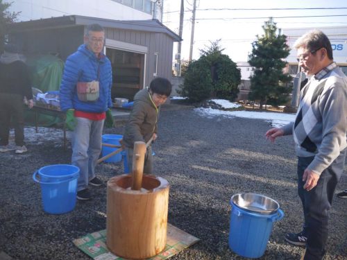 豊四季町会の恒例行事となった「新春餅つき大会」が、1月4日(日)公民館前の広場(一本松稲荷神社境内)で盛大に開催されました。好天にも恵まれ、朝10時前には一番臼が炊き上がり、餅つき開始です。