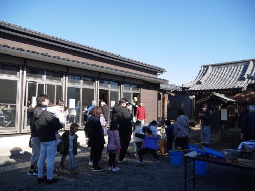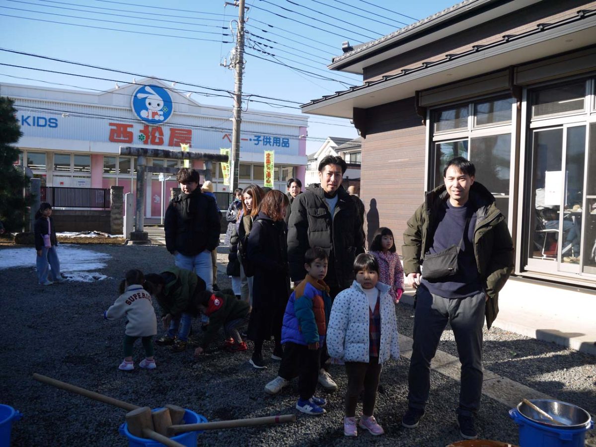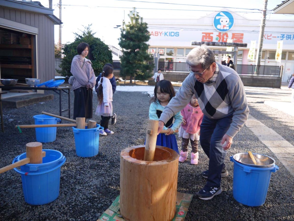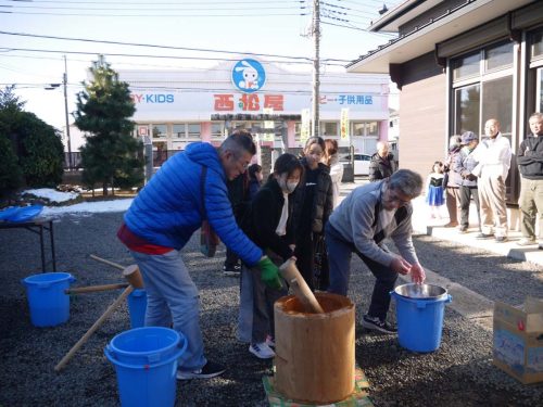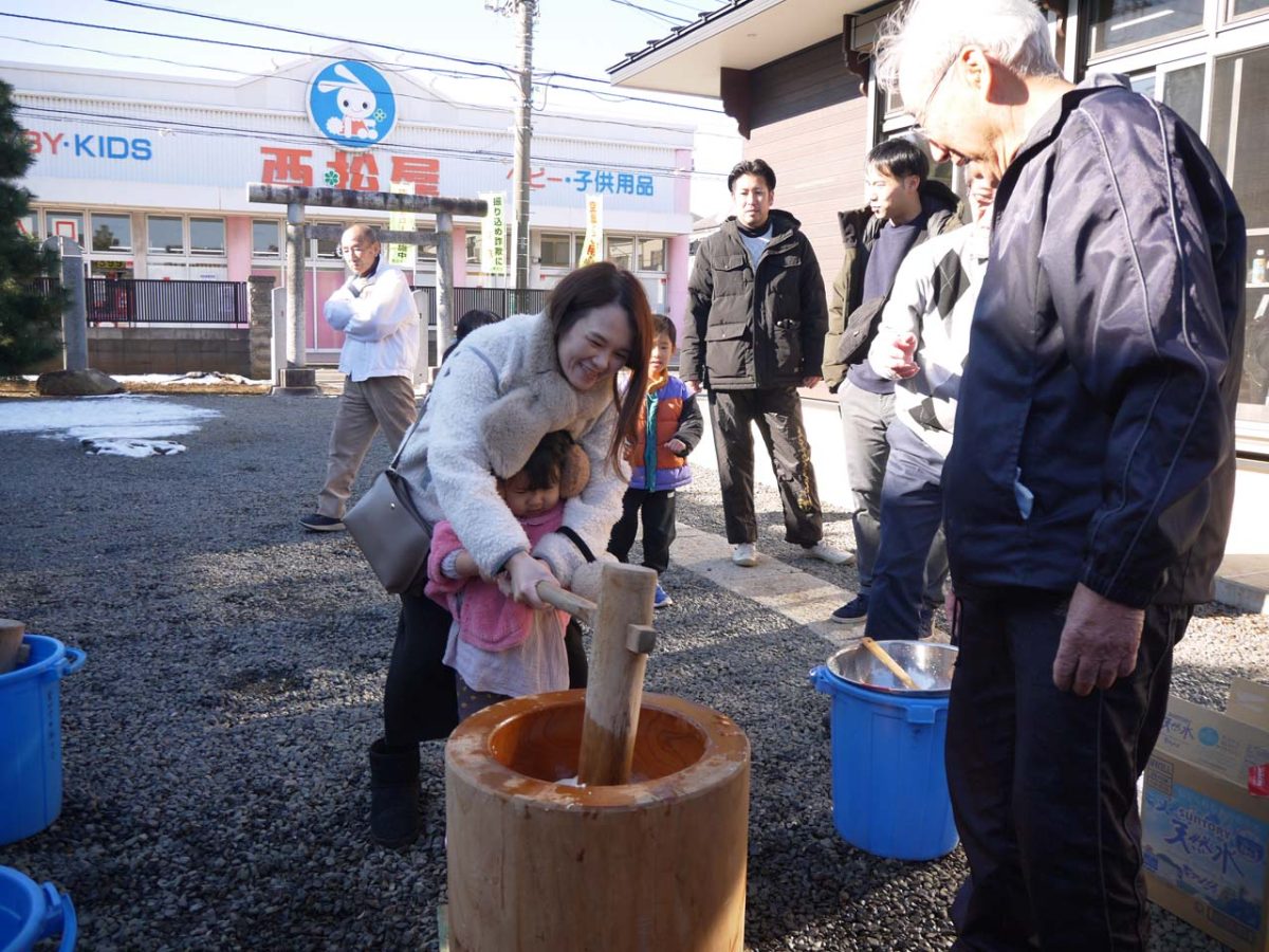 つきたての餅は、民生委員、親子会、OB会のお母さんたちが、即座にあんこ餅、きなこ餅、のり餅に。 集会室では、つきたてのお餅が振る舞われ、その柔らかさと美味しさに子どもたちも大喜び。用意した25kg(約16升)の餅米も全てつき、振る舞われました。