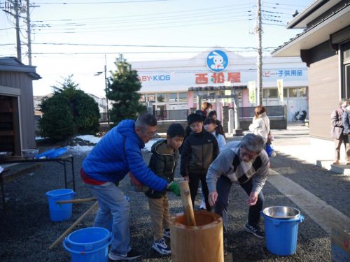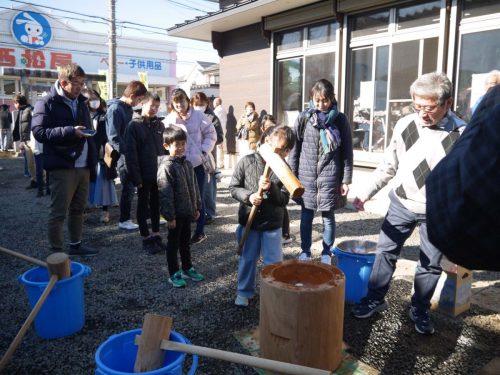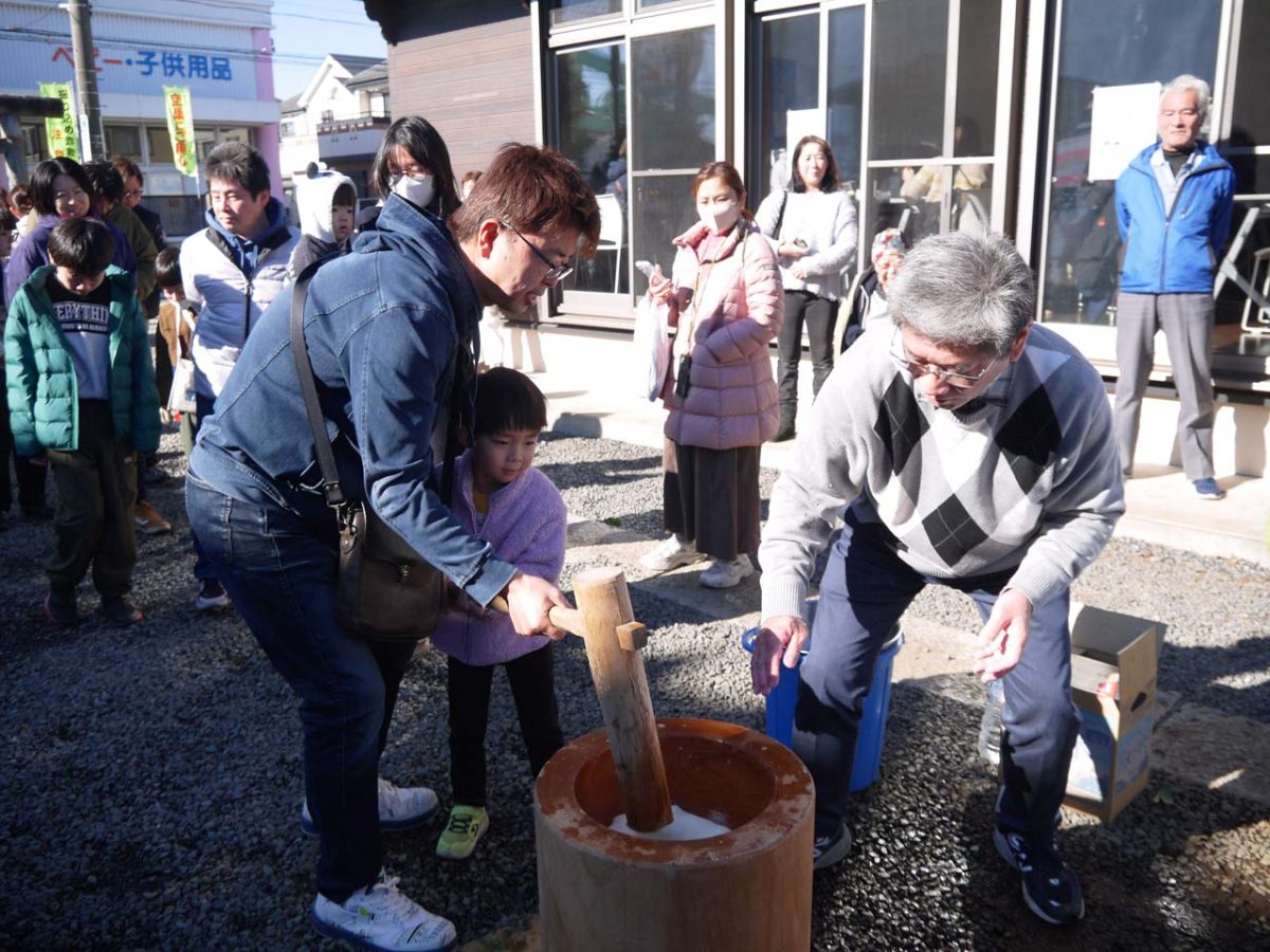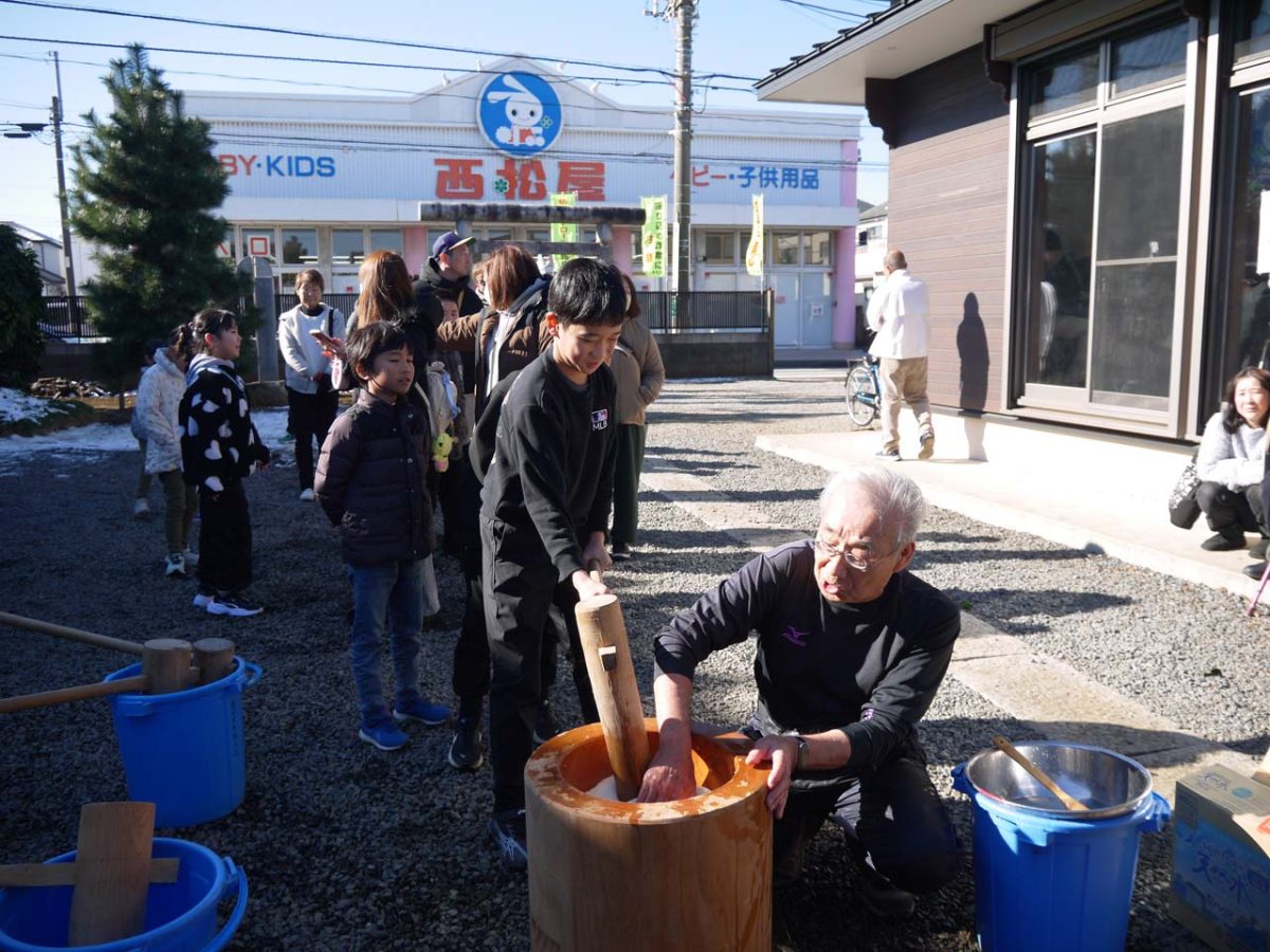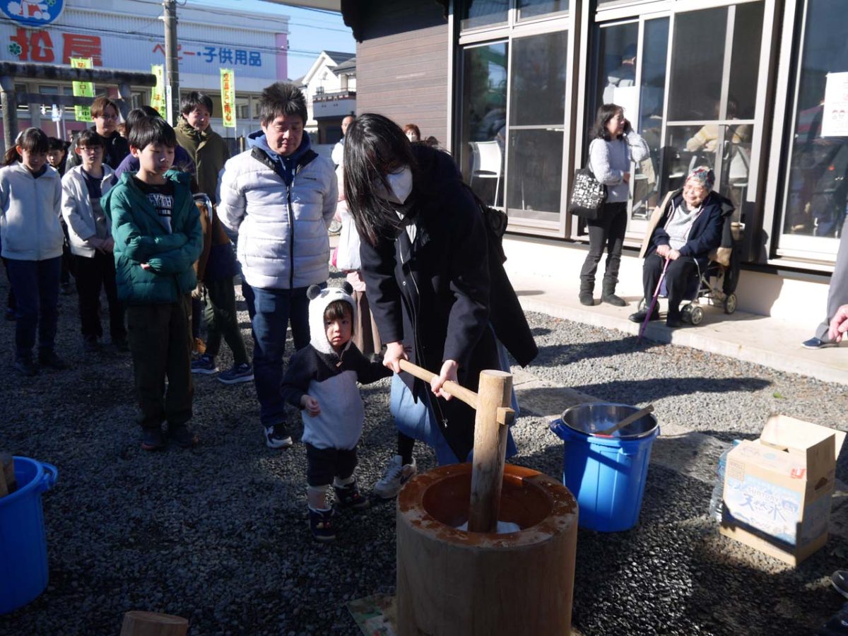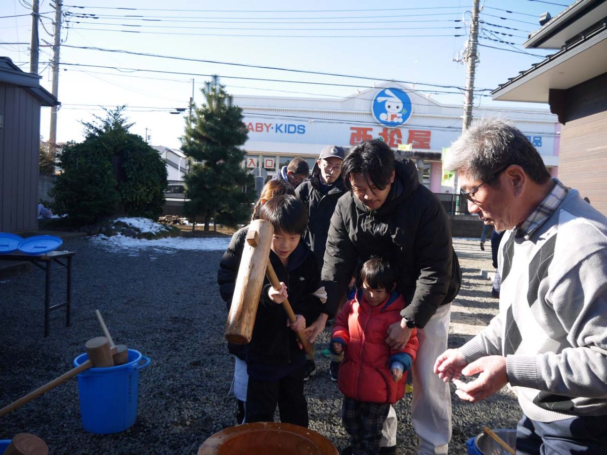広場には沢山の親子連れが集い、その数は昨年(約160人)を上回る240人でした。お父さんたち、そして子供たちが力を絞って杵を振ります。初めて餅つきにチャレンジする子どもたちも多く、広場に歓声がこだましました。