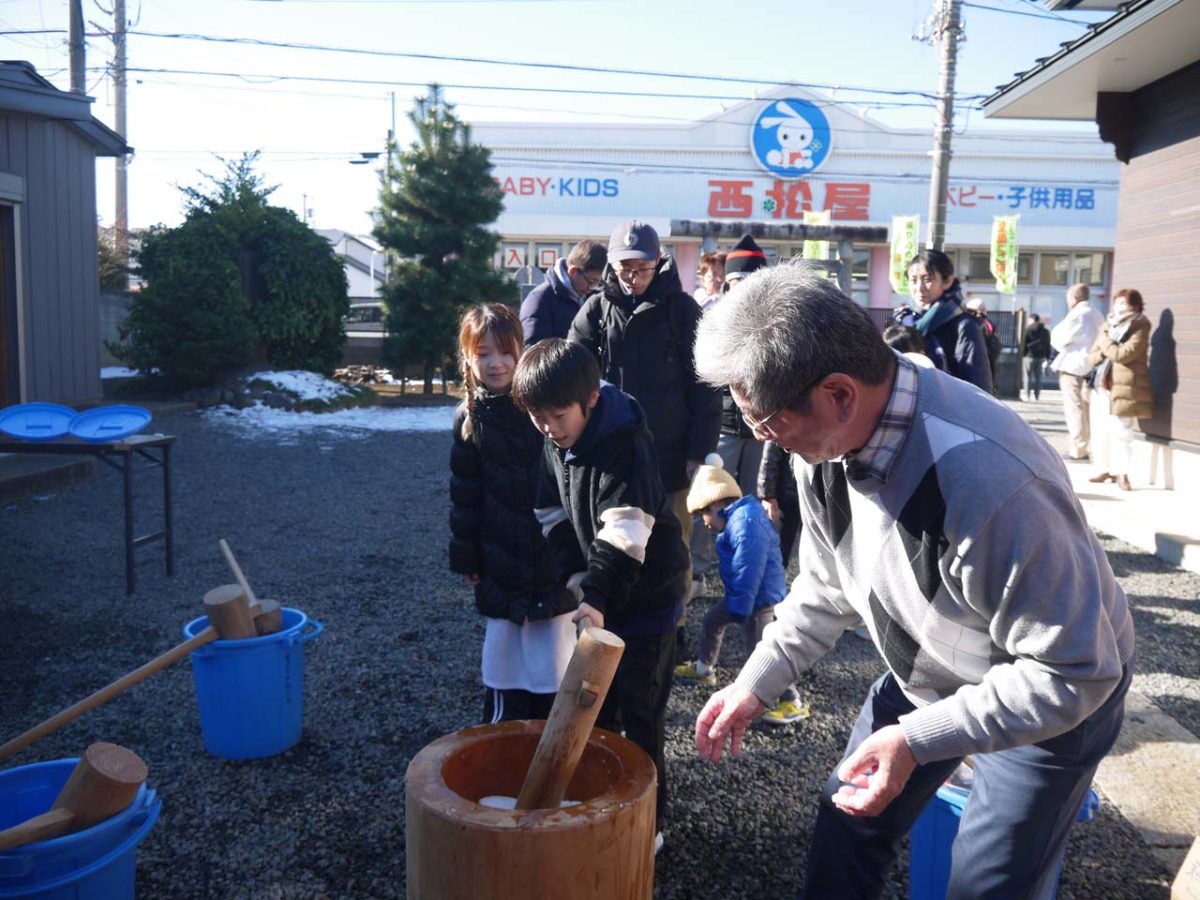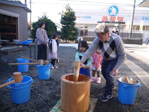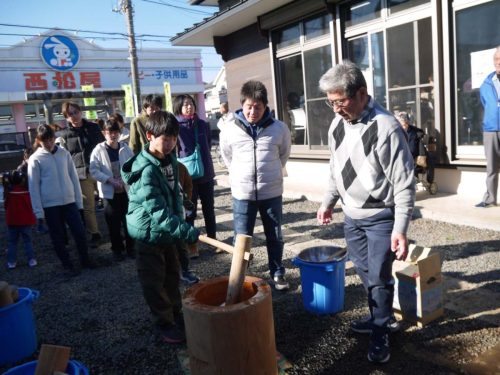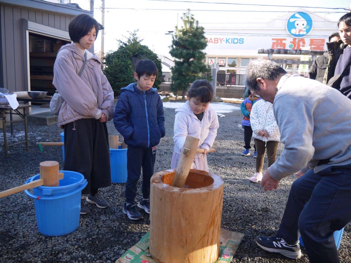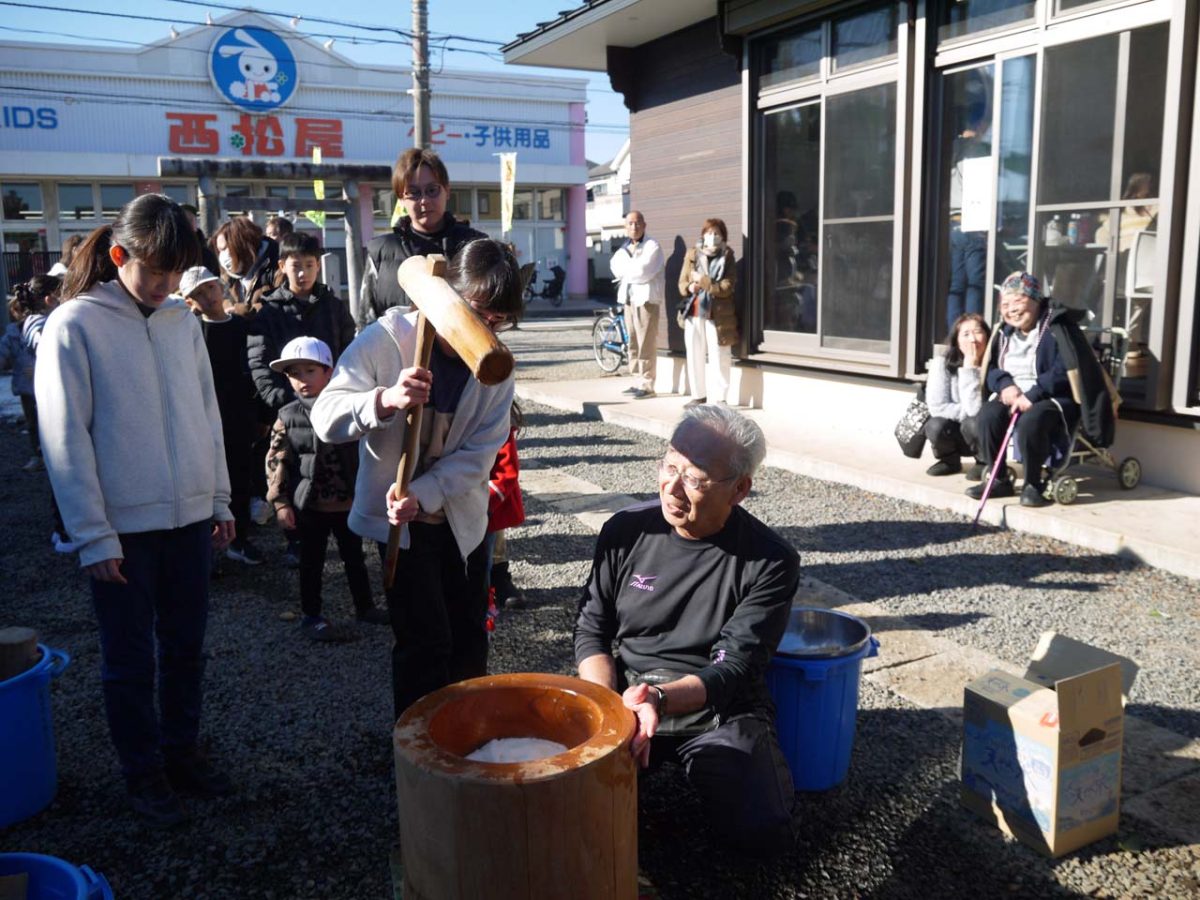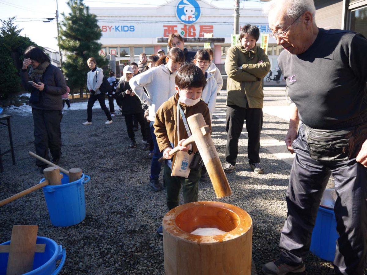 広場には沢山の親子連れが集い、その数は昨年(約160人)を上回る240人でした。お父さんたち、そして子供たちが力を絞って杵を振ります。初めて餅つきにチャレンジする子どもたちも多く、広場に歓声がこだましました。