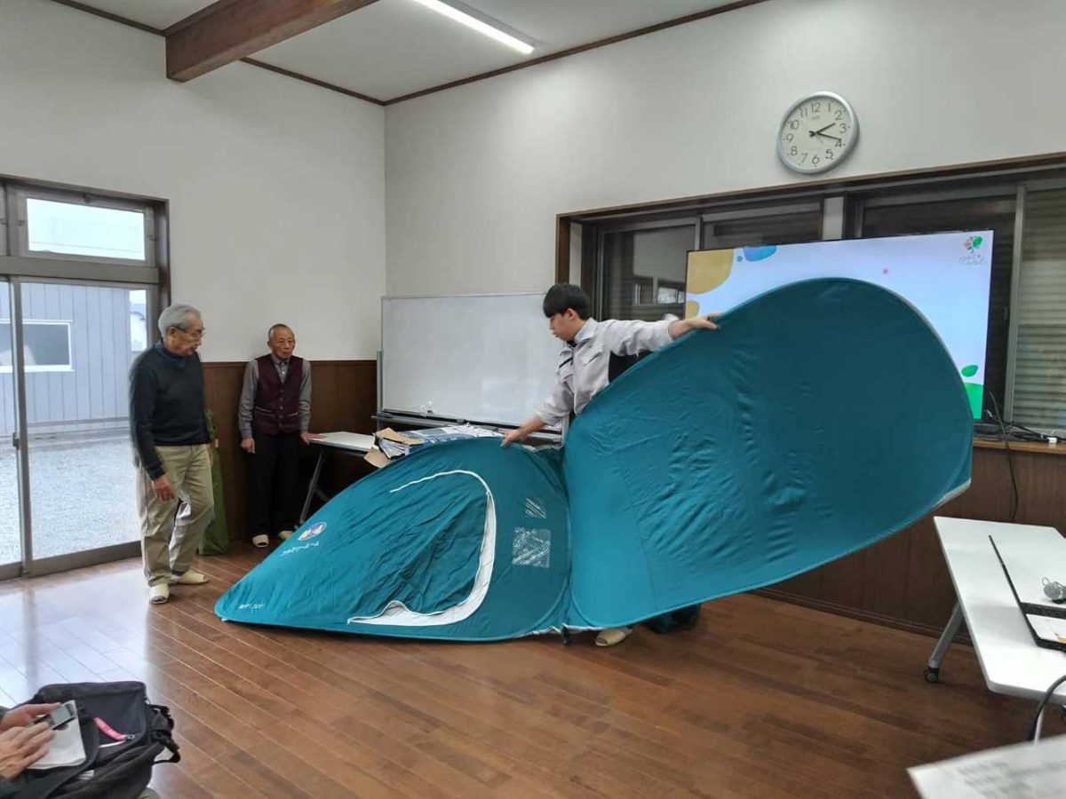 引き続き防災に関しては、同防災安全課の竹柿さんからスライドを使って、柏市の防災への取り組み状況や被災時の避難所・避難場所について説明がありました。避難所に設置させるテントや簡易ベッドも実際に展示されました。又、自助による日頃からの備蓄(最低3日間、出来れば1週間)の重要性についてもお話がありました。(柏市防災関連HPはこちらから)