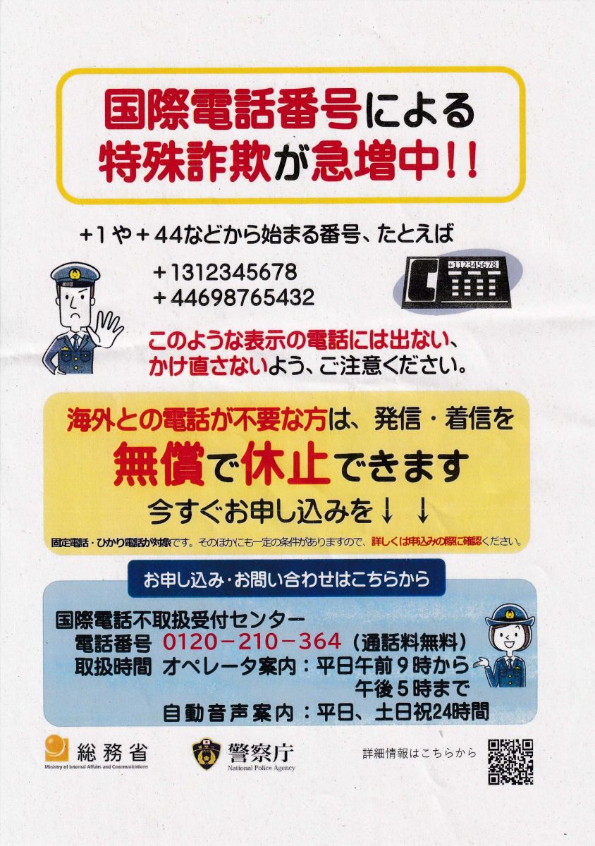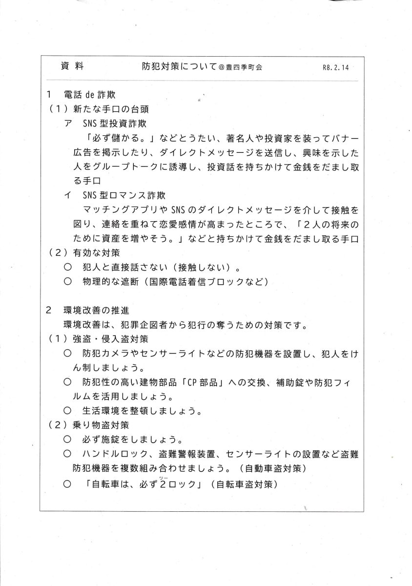 ① 電話de詐欺 ②環境改善推進 についてお話がありました。 特に「犯人と直接話さない」「侵入対策と施錠の徹底」が対策として重要と強調されました。